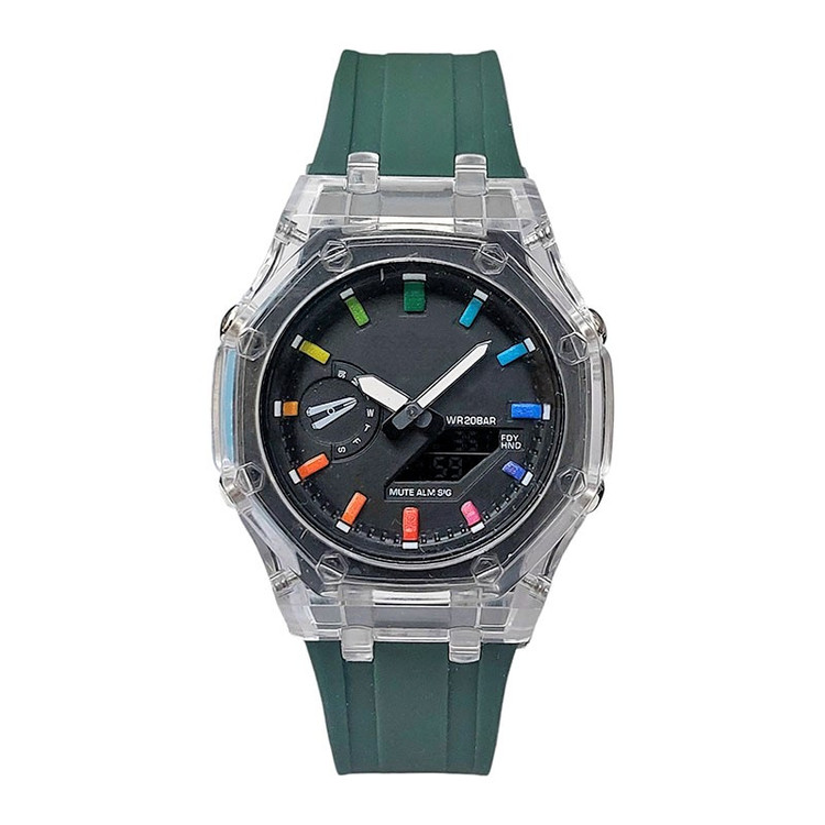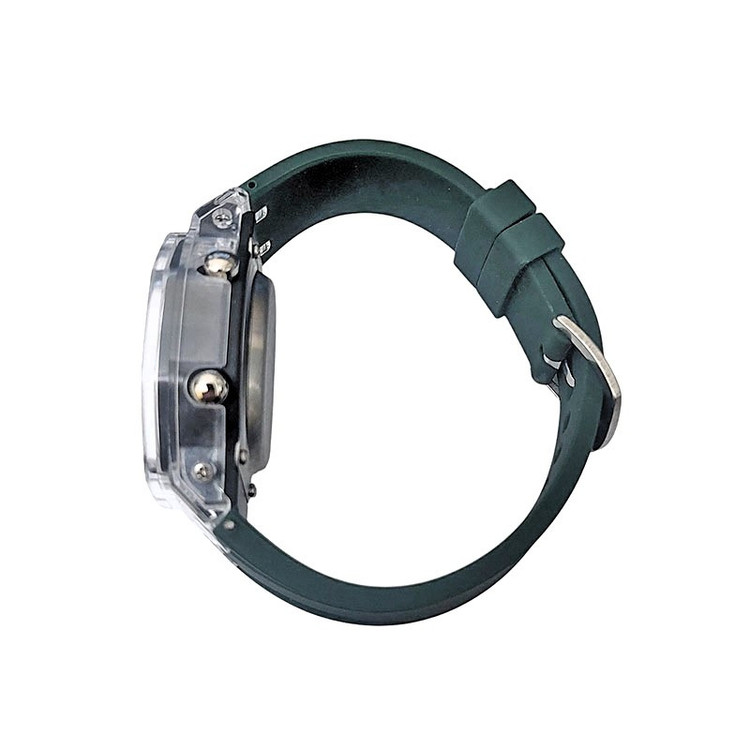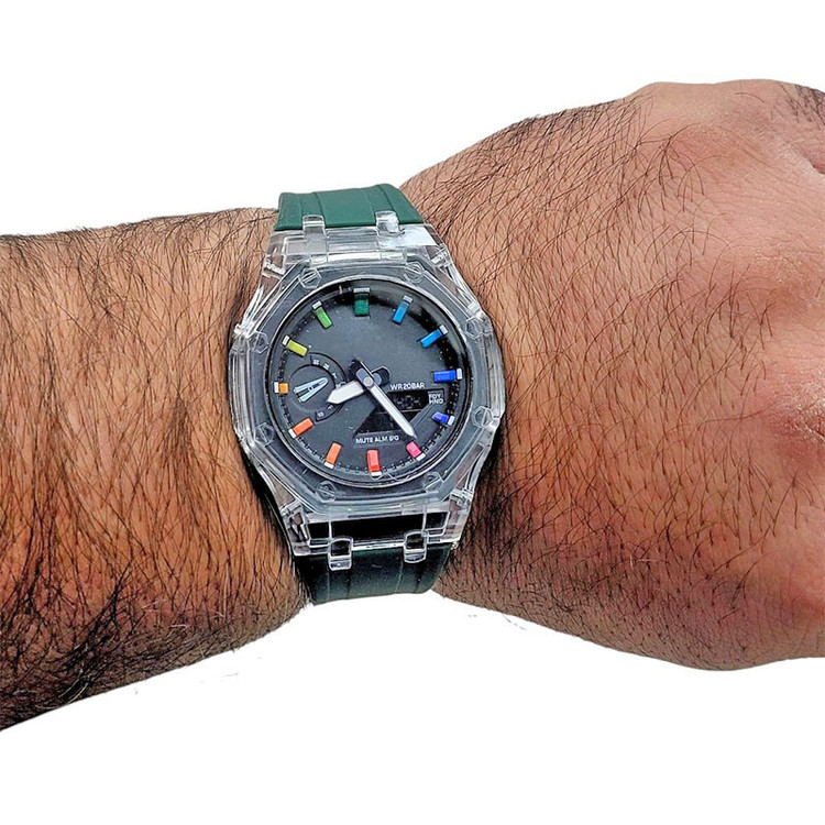 جهت تنظیم ساعت با فشار دادن و نگه داشتن دکمه سمت راست پایینی عقربه ها شروع به حرکت کرده و روی زمان مورد نظر با فشردن مجدد متوقف میشوند