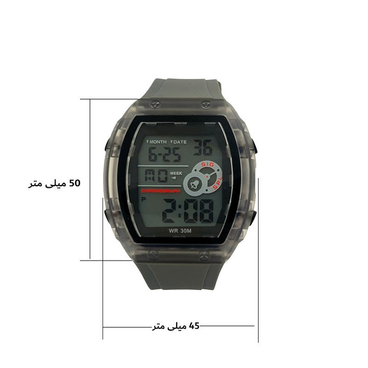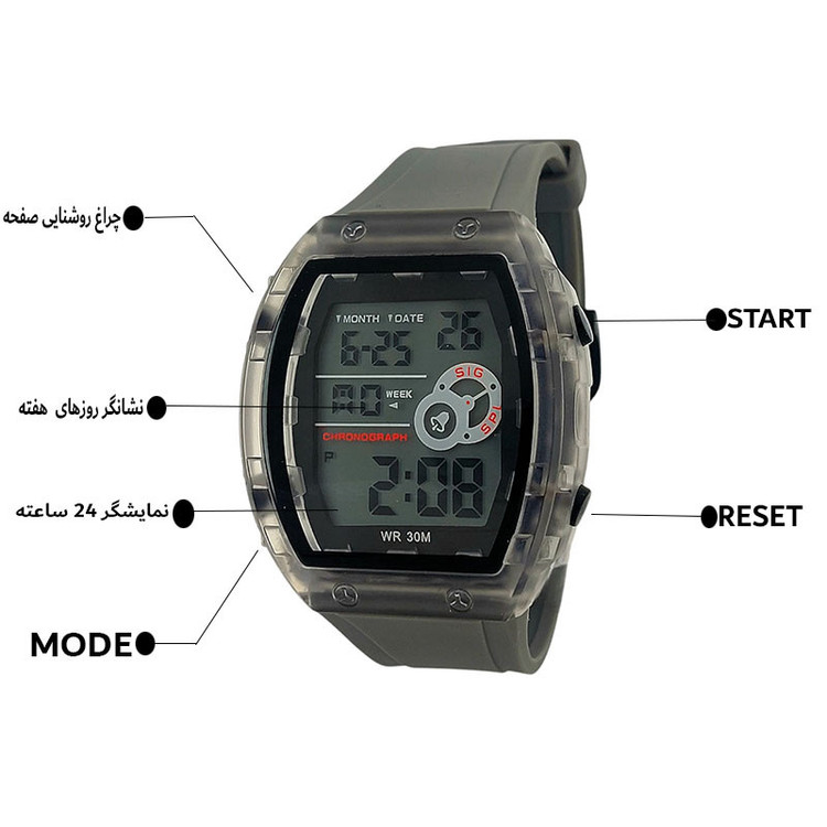 صفحه طرحدار , نمایش 24 ساعته , نور پس زمینه , آلارم , ضد آب , کرنوگراف , تاریخ شمار