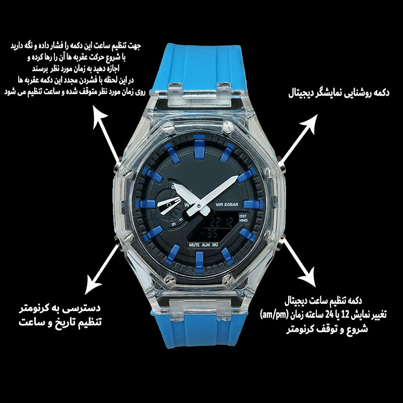شیشه ضد انعکاس , ضد آب , کرنوگراف , آلارم , تاریخ شمار , نور پس زمینه , نمایش ساعت دوم , نمایش 24 ساعته , عقربههای شبتاب , صفحه طرحدار