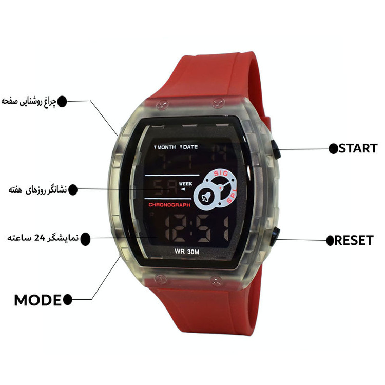 صفحه طرحدار , نمایش 24 ساعته , نور پس زمینه , تاریخ شمار , آلارم , کرنوگراف , ضد آب