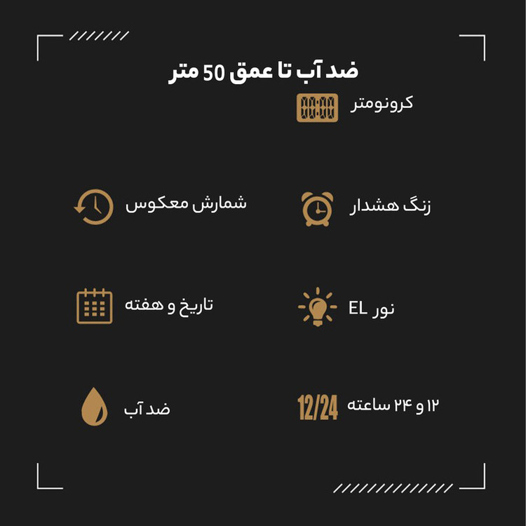 تایمر , صفحه طرحدار , نمایش 24 ساعته , نور پس زمینه , تاریخ شمار , آلارم , کرنوگراف