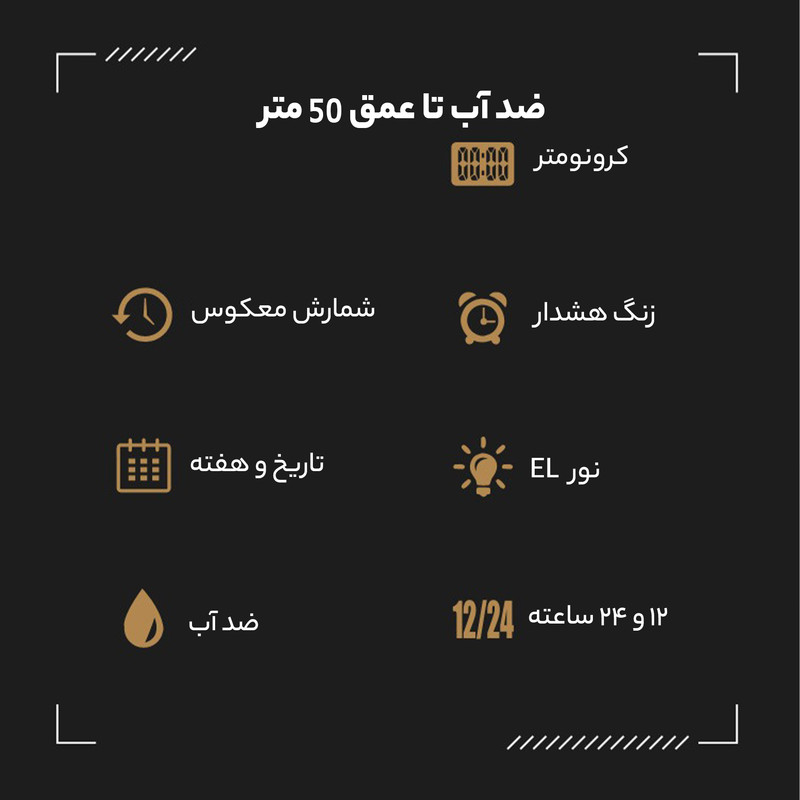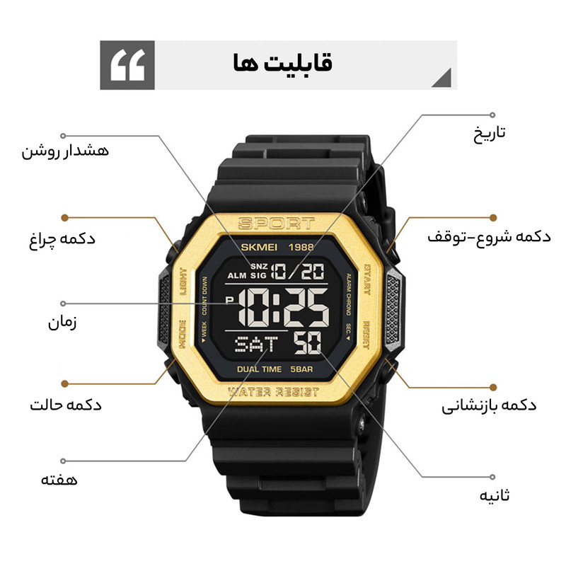 تایمر , صفحه طرحدار , نمایش 24 ساعته , نور پس زمینه , تاریخ شمار , آلارم , کرنوگراف