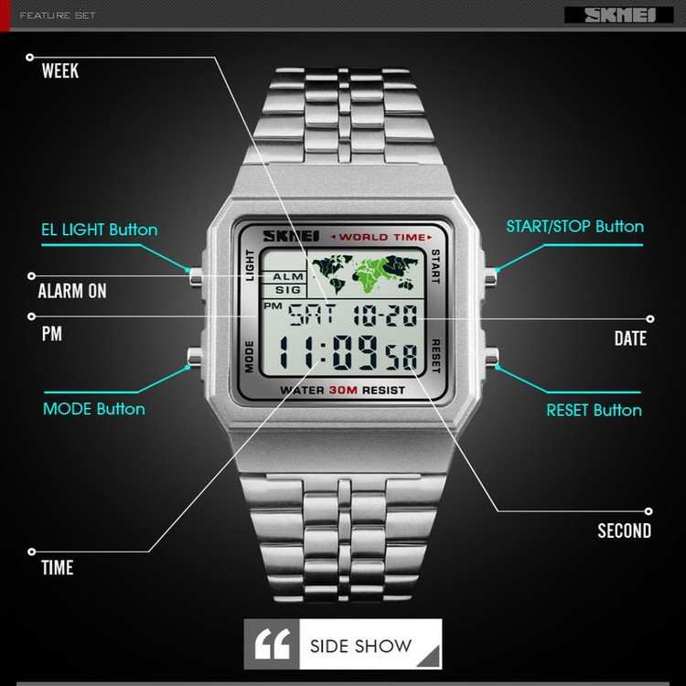 نمایش 24 ساعته , تاریخ شمار , نور پس زمینه , تایمر , آلارم