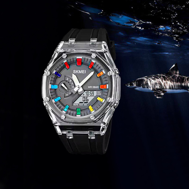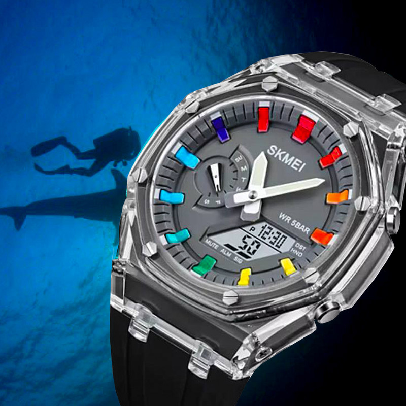 ضدآب تا عمق 30 متر ، دارای نشانگر روزهای هفته، نمایش 24 ساعته ، نمایش ساعت دوم ، قابلیت تنظیم 5 آلارم ، نور پس زمینه