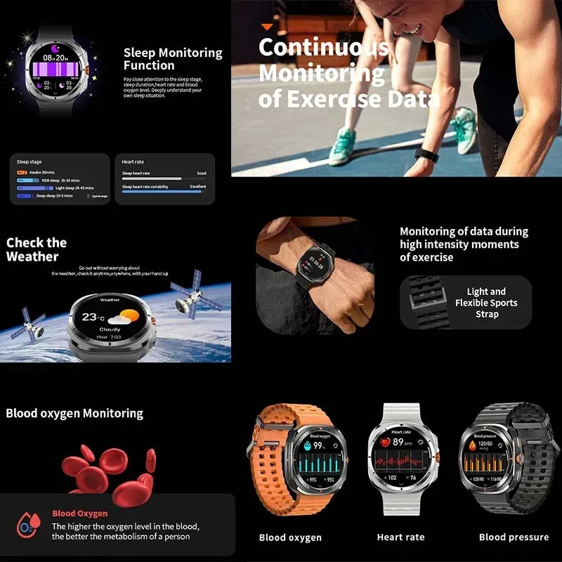صفحه نمایش رنگی , صفحه نمایش لمسی , دوربین , کنترل موسیقی (Music Player) , کنترل سطح اکسیژن خون , قابلیت مکالمه از طریق بلوتوث , پشتیبانی از زبان فارسی در منو و سیستمعامل , قابلیت تغییر طرح ساعت یا تم , ضد آب