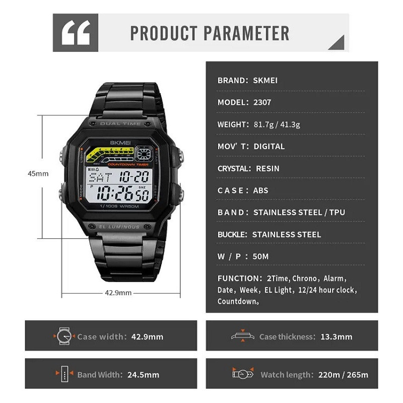 تایمر , صفحه طرحدار , نمایش 24 ساعته , نمایش ساعت دوم , نور پس زمینه , تاریخ شمار , آلارم , کرنوگراف , ضد آب
