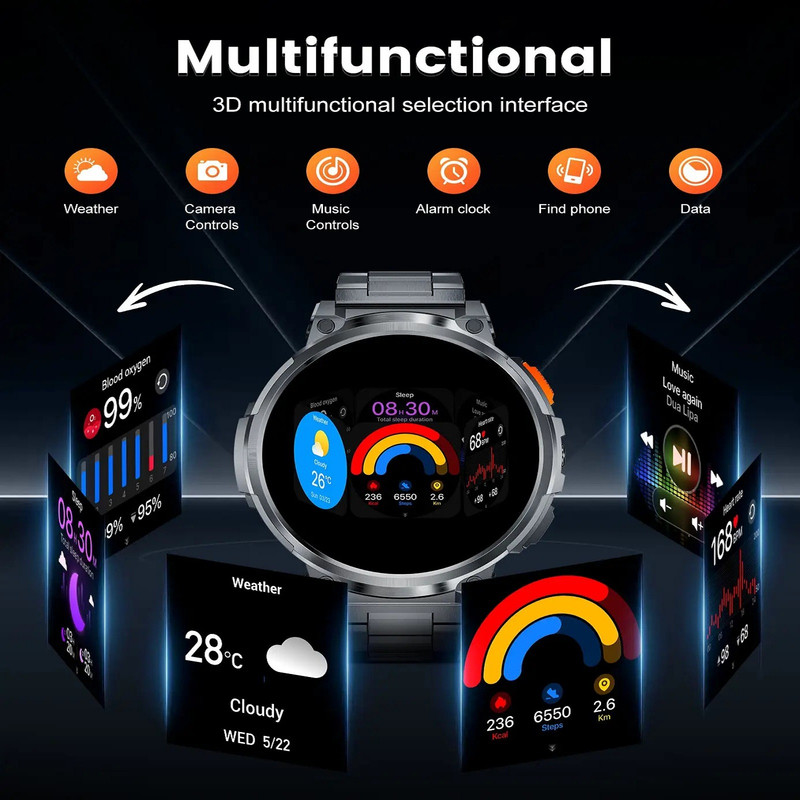 صفحه نمایش رنگی , صفحه نمایش لمسی , دوربین , کنترل موسیقی (Music Player) , کنترل سطح اکسیژن خون , قابلیت مکالمه از طریق بلوتوث , قابلیت تغییر طرح ساعت یا تم , ضد آب