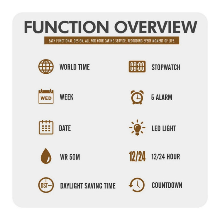نمایش 24 ساعته , نمایش ساعت دوم , عقربههای شبتاب , تاریخ شمار , آلارم , شیشه ضدخش , کرنوگراف , ضد آب