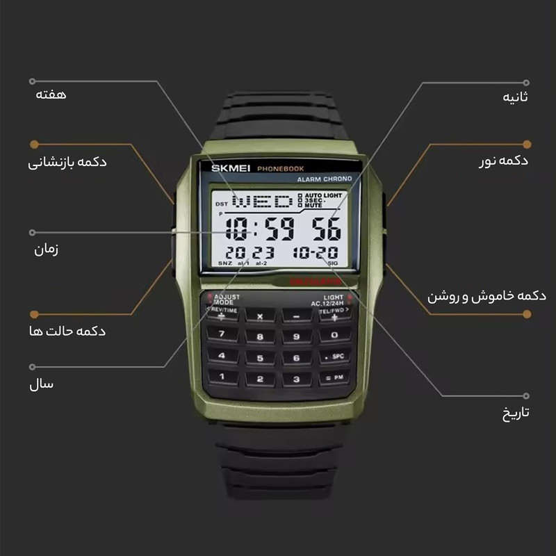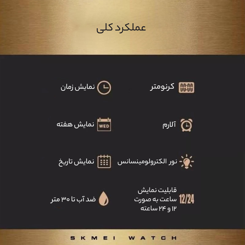 تایمر , صفحه طرحدار , نمایش 24 ساعته , نمایش ساعت دوم , نور پس زمینه , تاریخ شمار , آلارم , کرنوگراف