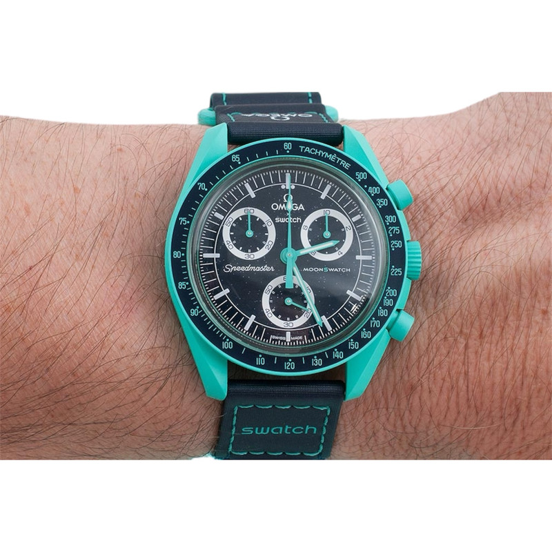 این ساعت فول پک حاصل همکاری دو شرکت بزرگ ساعتسازی در جهان به نامهای امگا و سواچ است که با همفکری یکدیگر توانستهاند سری ساعتهای ماموریت به سوی سیارات منظومه شمسی را طراحی و به بازار جهانی عرضه کنند. یکی از مدلهای جذاب و زیبا این سری ساعت امگاسواچ ماموریت به سوی زهره است که با رنگ سرمه ایی جذابی که دارد همه را مجذوب خودش کرده است. شما با خرید ساعت امگاسواچ مدل ماموریت به سوی زهره، یک ساعت با بدنهای از جنس بایوسرامیک را خواهید داشت که به قاب ساعت استحکام و مقاومت زیادی را در برابر ضربه و خطوخش بخشیده است. موتوری که با خرید ساعت امگاسواچ مدل ماموریت به سوی زهره برروی این ساعت زیبا قرار گرفته است، 3 موتور کرنوگراف باتری خور سوئیسی است که از کیفیت ساخت زیادی برخوردار است و به ساعت یک دقت بالا را در نمایش زمان میدهد. بند این ساعت نیز از جنس برزنت میباشد که به صورت چسبی برروی دست شما بسته خواهد شد و به شما یک راحتی فوقالعاده را در هنگام استفاده از آن خواهد داد.