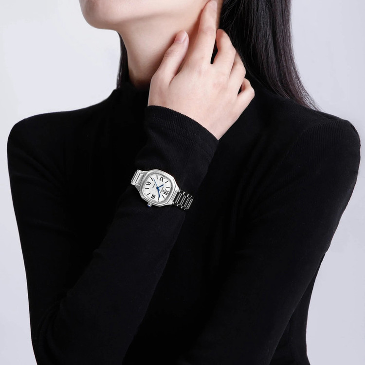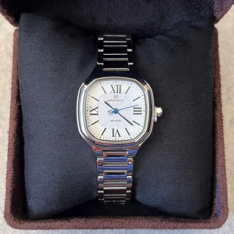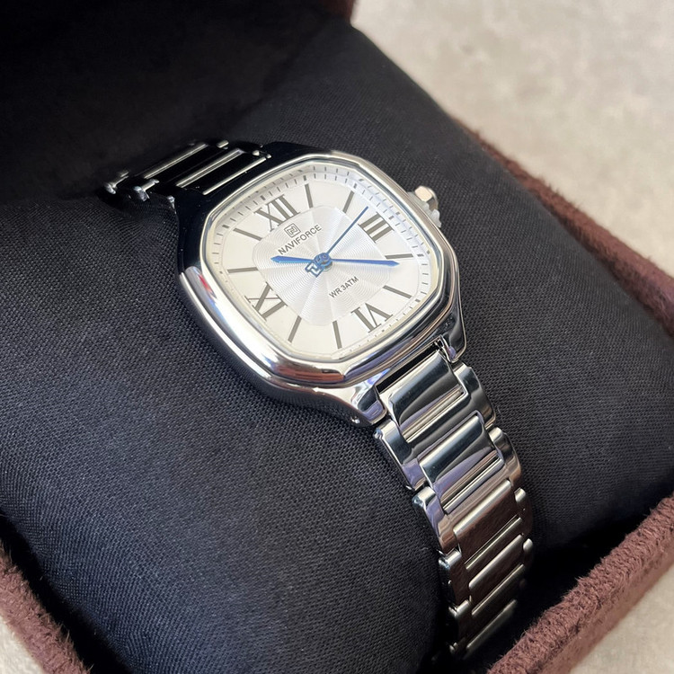 این مدل از ساعت مچی های زنانه و دخترانه برند نیوی فورس بر اساس سبک کلاسیک و اسپرت و روزمره بوده و دارای طراحی بسیار زیبایی می باشد.شیشه ی معدنی ضد خش و بند و بدنه ی این ساعت استیل بسیار باکیفیت رنگ ثابت و ضدخش بوده که از رنگ نقره ای در آن استفاده شده است و جزو ساعت های خوش فروش برند نیوی فورس است و جزو بهترین و مناسب ترین ایده ها برای کادوی زنانه و دخترانه در مناسبت های مختلف میباشد. طراحی متفاوت شکل بدنه ی این ساعت که چند ضلعی است چشم هر بیننده ای را مینوازد. این ساعت دارای 30متر مقاومت در برابر آب است. همچنین روی قفل و روی سرکوک ساعت و روی عقربه ی ثانیه شمار و صفحه ی ساعت و پشت درب برند نیوی فورس حک شده است. و دارای هولوگرام پشت درب و دفترچه نیز میباشد. این ساعت زنانه نیوی فورس در جعبه ای باکیفیت و شیک و کادویی خدمت شما ارسال میگردد.