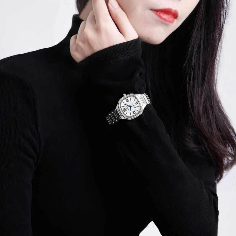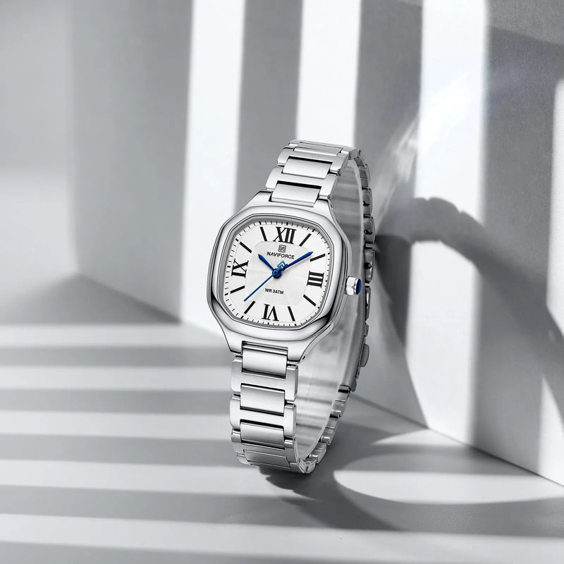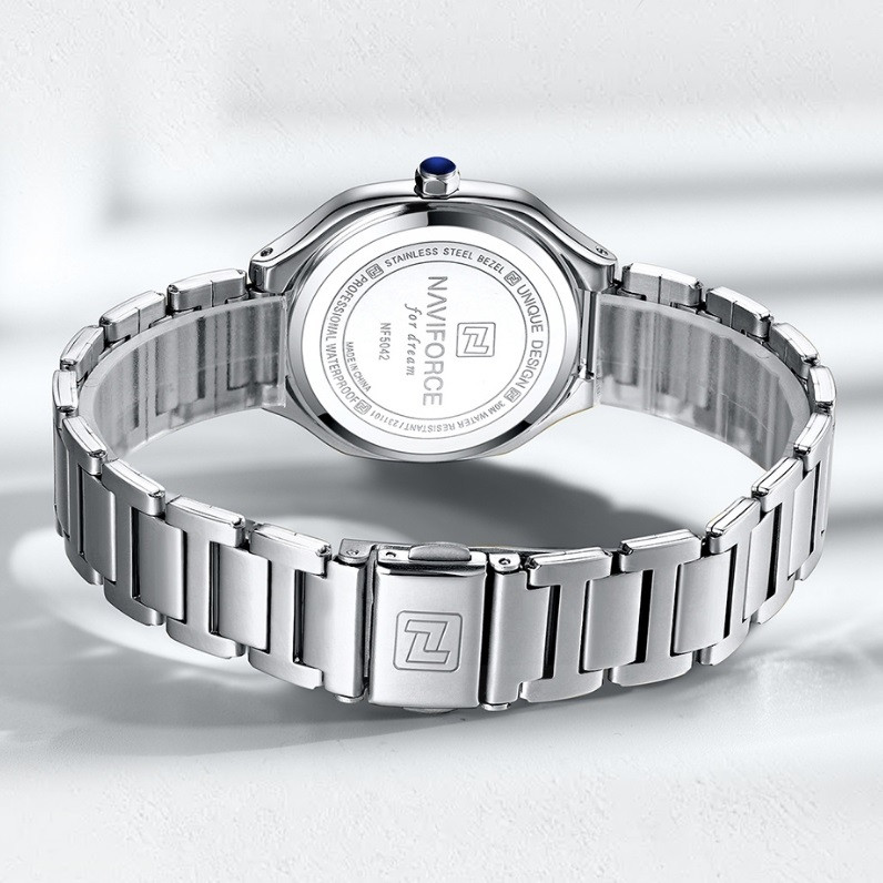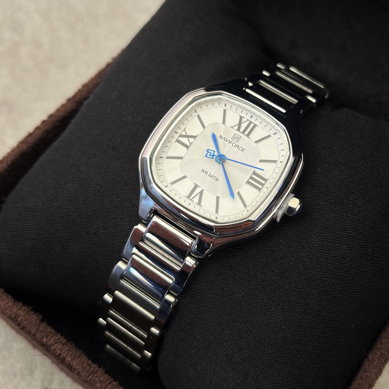 این مدل از ساعت مچی های زنانه و دخترانه برند نیوی فورس بر اساس سبک کلاسیک و اسپرت و روزمره بوده و دارای طراحی بسیار زیبایی می باشد.شیشه ی معدنی ضد خش و بند و بدنه ی این ساعت استیل بسیار باکیفیت رنگ ثابت و ضدخش بوده که از رنگ نقره ای در آن استفاده شده است و جزو ساعت های خوش فروش برند نیوی فورس است و جزو بهترین و مناسب ترین ایده ها برای کادوی زنانه و دخترانه در مناسبت های مختلف میباشد. طراحی متفاوت شکل بدنه ی این ساعت که چند ضلعی است چشم هر بیننده ای را مینوازد. این ساعت دارای 30متر مقاومت در برابر آب است. همچنین روی قفل و روی سرکوک ساعت و روی عقربه ی ثانیه شمار و صفحه ی ساعت و پشت درب برند نیوی فورس حک شده است. و دارای هولوگرام پشت درب و دفترچه نیز میباشد. این ساعت زنانه نیوی فورس در جعبه ای باکیفیت و شیک و کادویی خدمت شما ارسال میگردد.