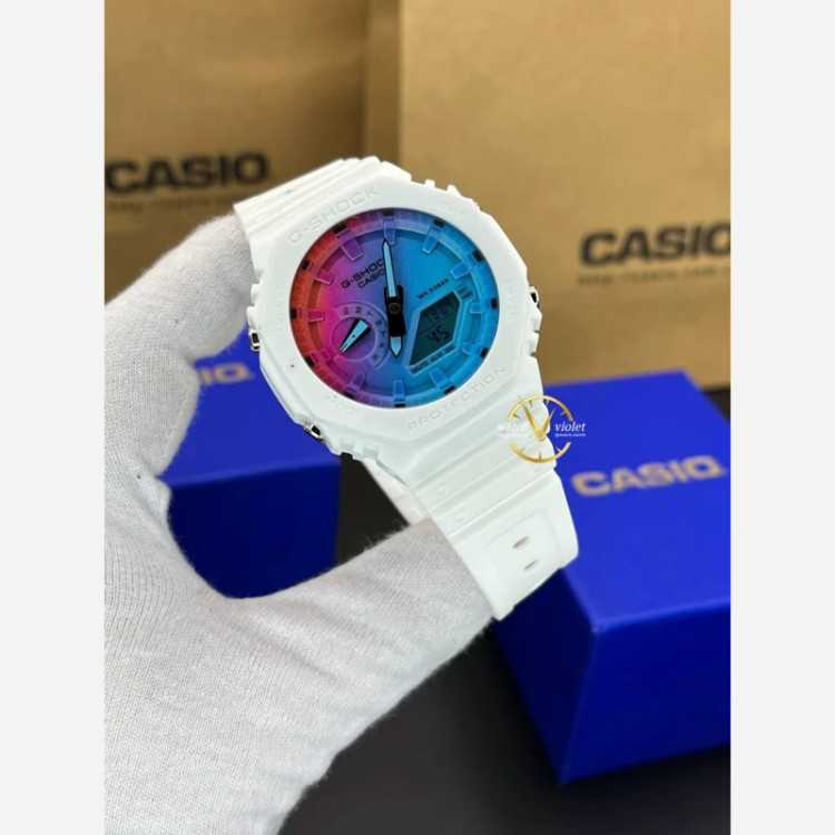 ساعت مچی جیشاک کاسیو صفحه و ایندکس رنگین کمانی بدنه و بند سفید