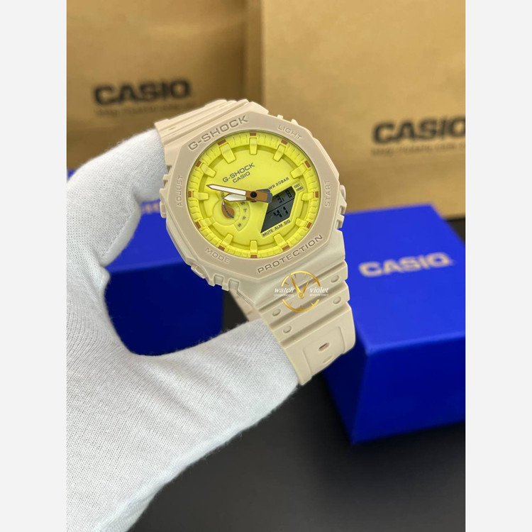 ساعت مچی کاسیو جیشاک صفحه زرد بدنه و بند کرمی