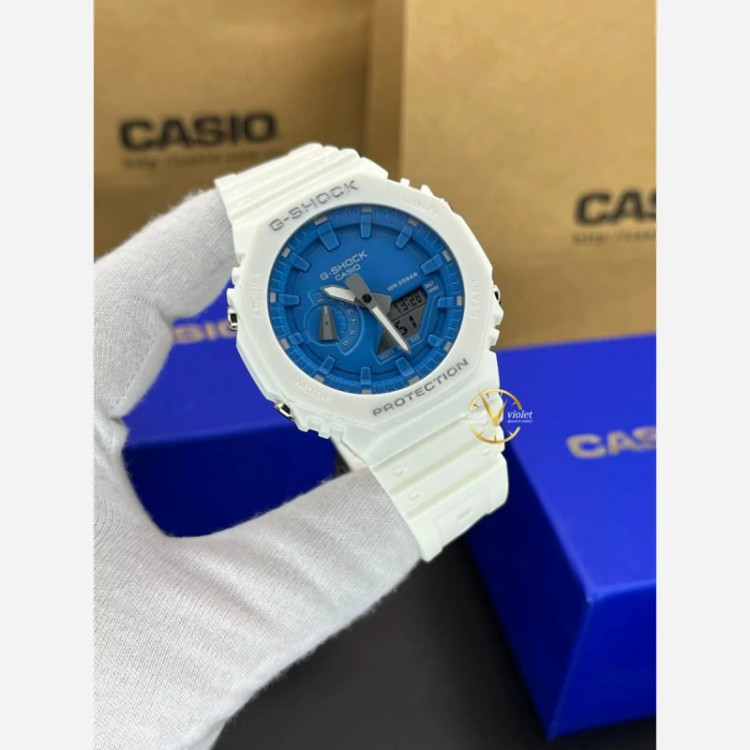 تخفیف ویژه + ساعت کاسیو جیشاک GA2100 صفحه آبی دور سفید بند سفید