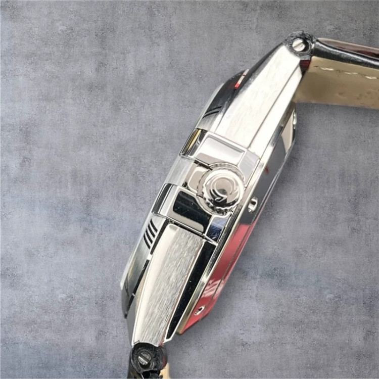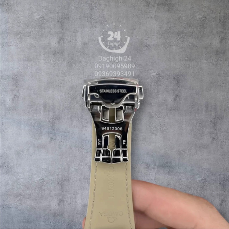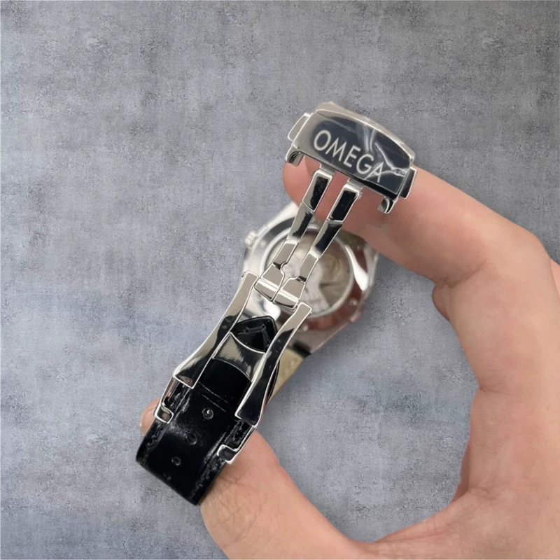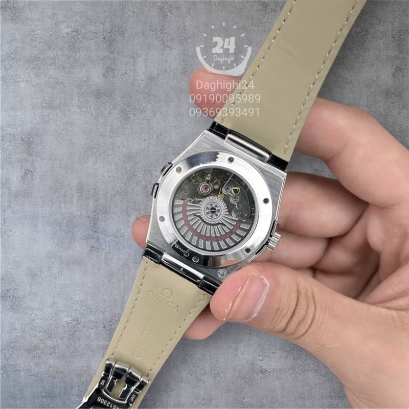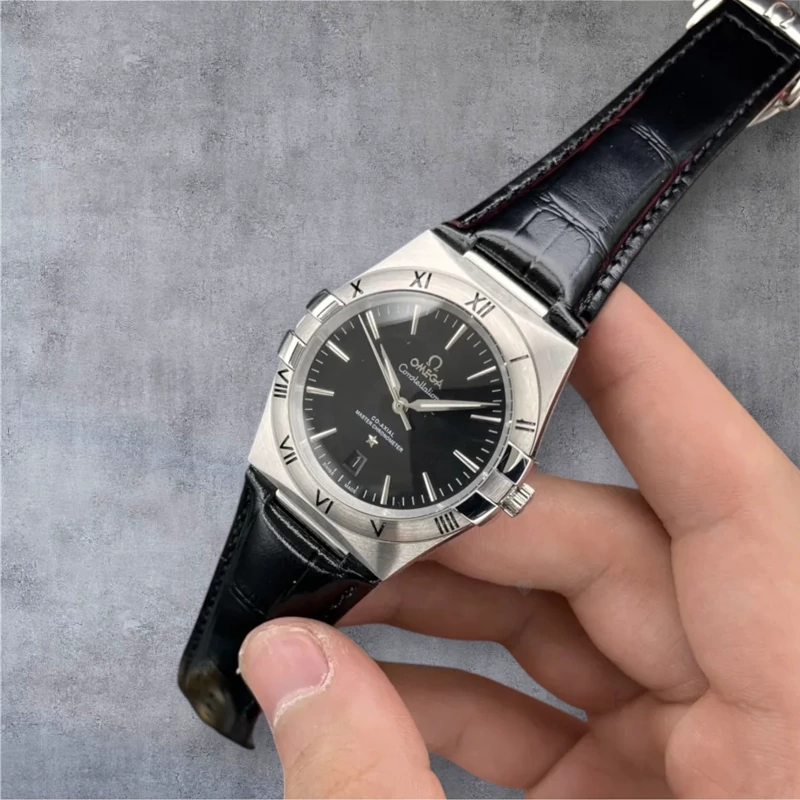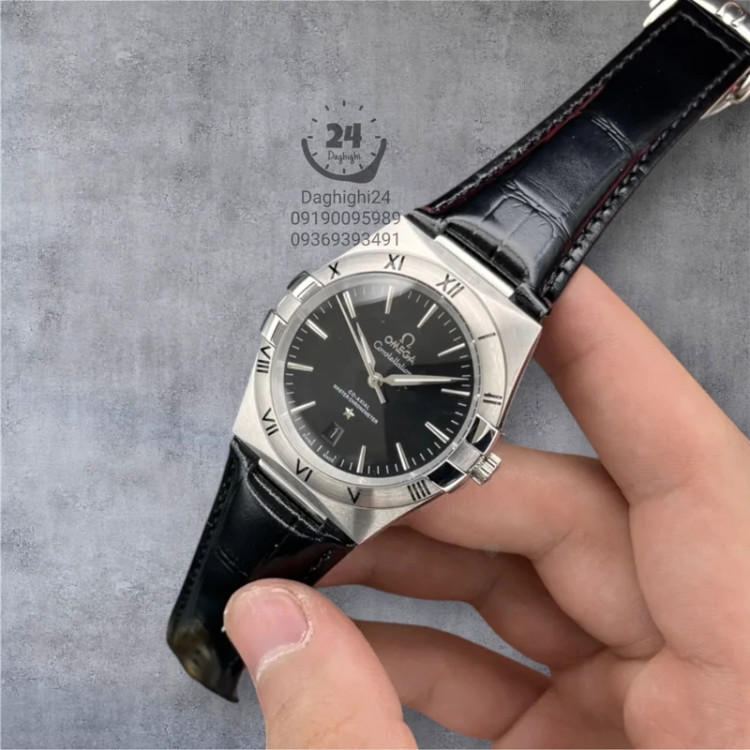 ساعت مچی امگا کانسلیشن موتور اتوماتیک بند چرم مردانه صفحه مشکی دور استیل