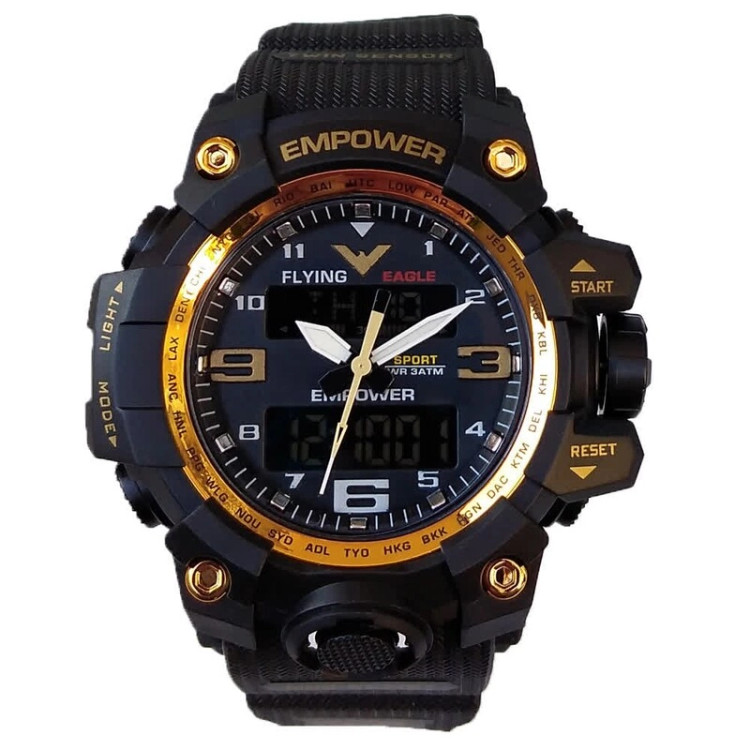 ساعت جی شاک ساعت مچی مردانه دوزمانه عقربه ای و دیجیتال مشکی طلایی ضدآب کرنومتر دار چراغ دید در شب آلارم SPORT G. SHOCK